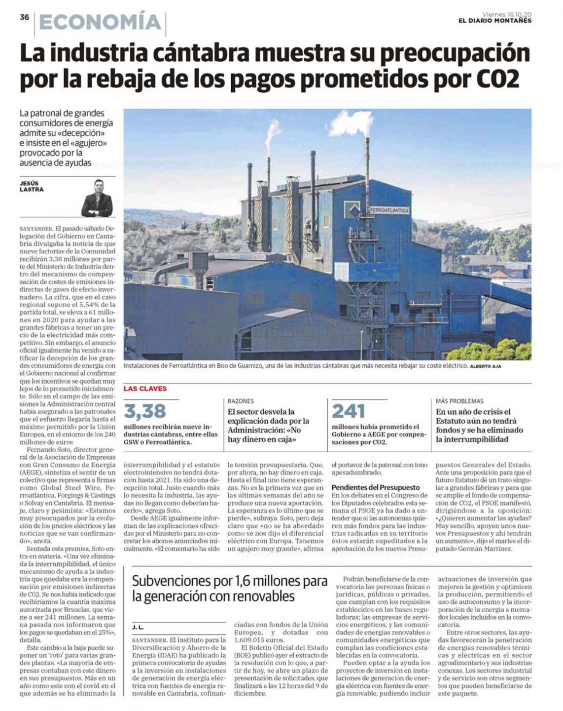 Detalle de la información que hoy, 16 de octubre de 2020, publica El Diario Montañés sobre la situación que atraviesa la industria cántabra.